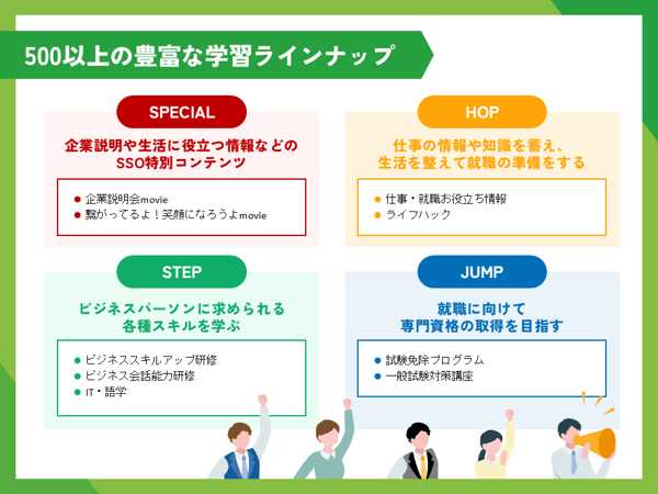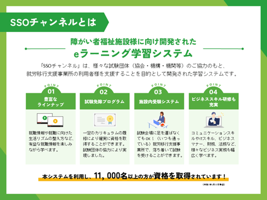 「SSOチャンネル」は、様々な試験団体(協会・機構・機関等)のご協力のもと、就労移行支援事業所の利用者様を支援することを目的として開発された学習システムです。たくさんのコンテンツがあり、学習したい分野を自由に視聴し、知識を深めることができます。