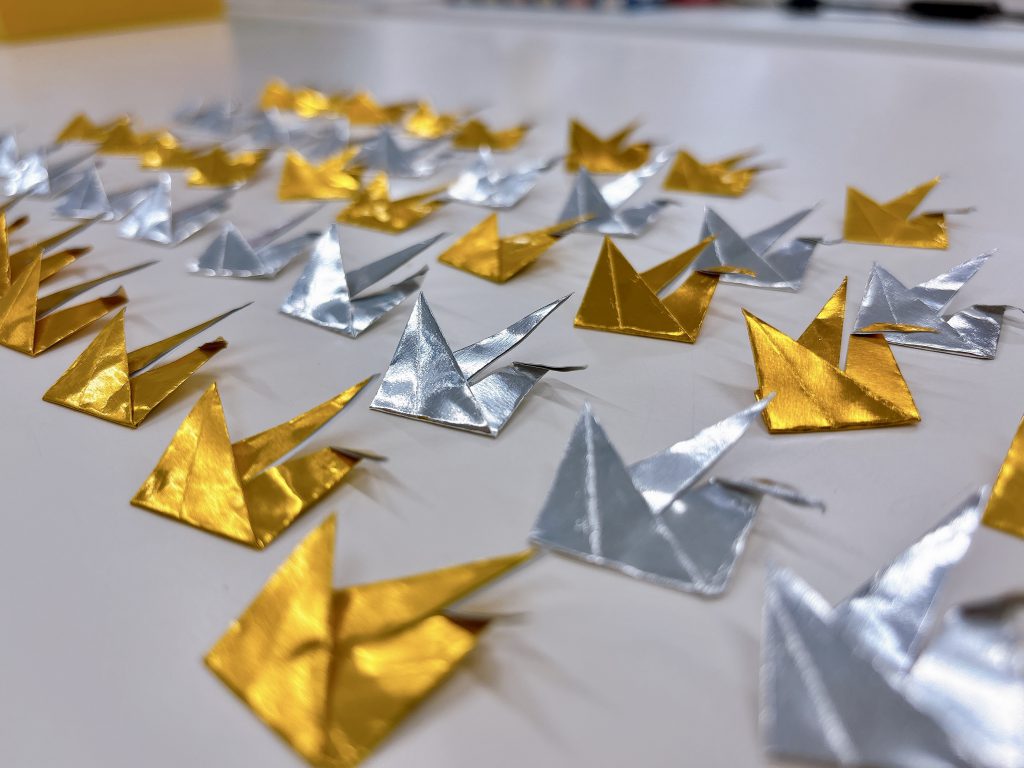 Yさんのご指導の下、手先器用部隊の皆様で作業を進めてくださった結果、たくさんの折り鶴が完成いたしました。これは利用者Aさんが作ってくださったものです。金と銀で美しいですね(*^^*)