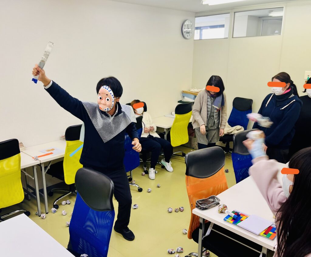 得体のしれない鬼に対して、みんなで古新聞紙で作った球を投げて追い払います。皆さん優しく、最初はとても遠慮されていたようでしたが、最後にはまあまあしっかりと強めにぶつけていて笑いました。