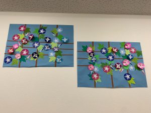 更にバージョンアップすべく、今日は暑い夏に涼を感じたい!という事で朝顔を折り紙で作成し壁を彩りました。6名で協力して作り上げました(^^♪