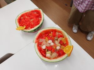 皆で協力して「ミルクレープ」と「すいか器のフルーツポンチ」を作りました。