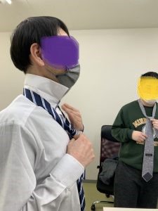 今回はメイクチームとネクタイチームに分かれて身だしなみマナーのグループワークを開催しました。
