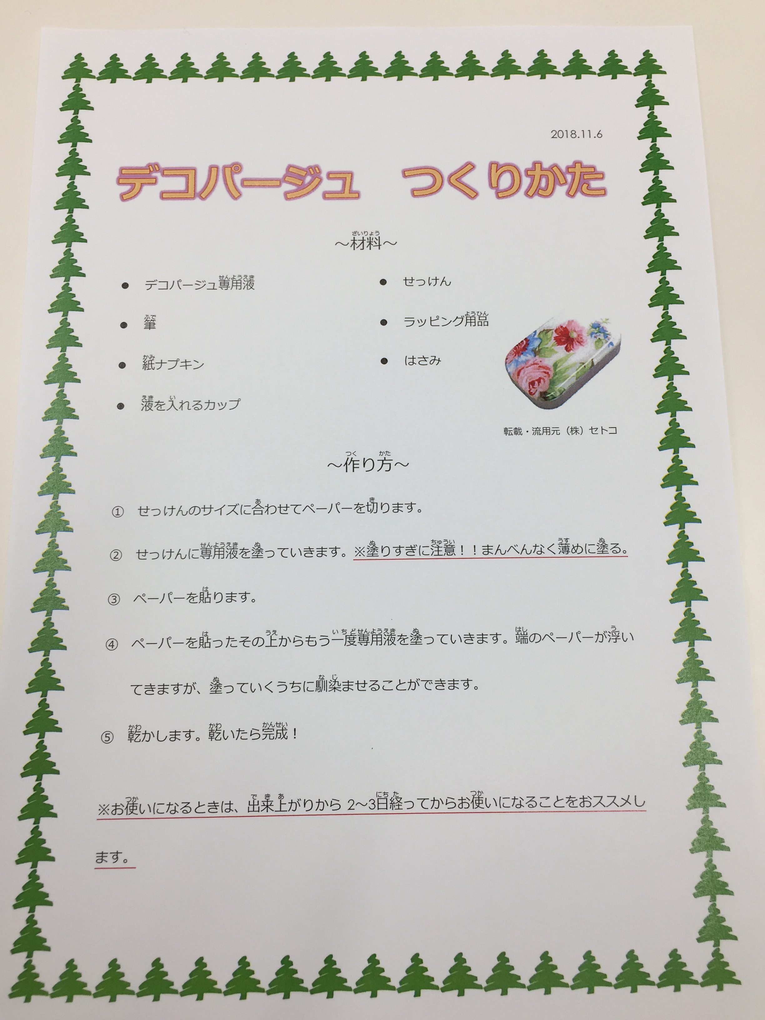 来週はデコパージュを作成予定です!ご興味がある方は是非のぞいてみてくださいね(^^)/