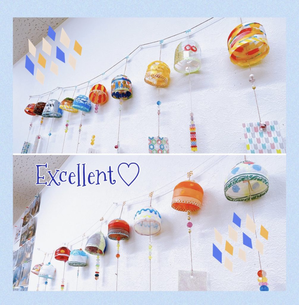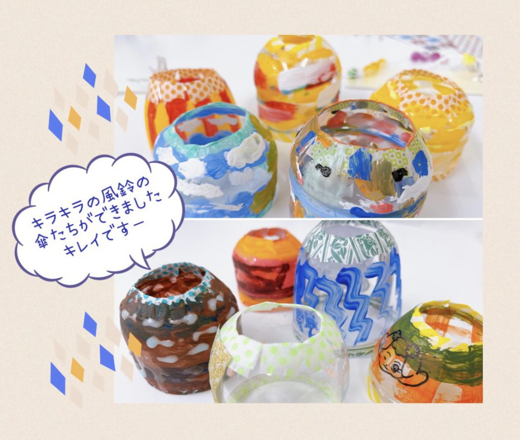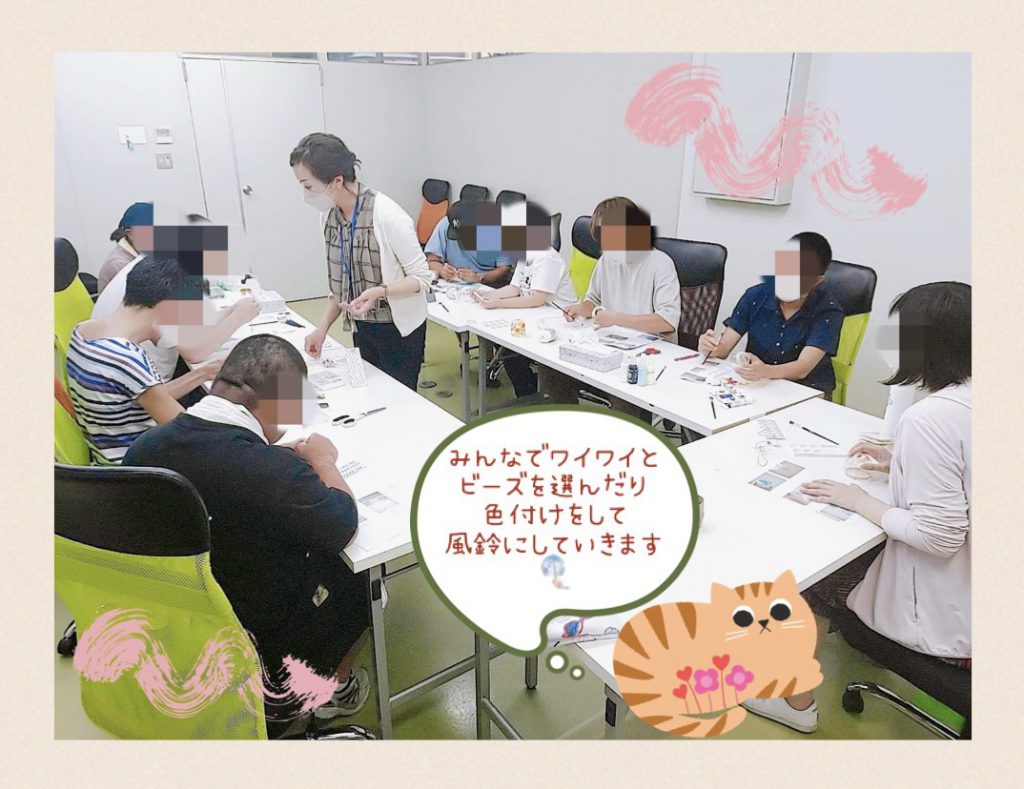 先日の作成ワークについてご報告いたします。季節はすでに秋ですが、暑い日々が続いておりますね。夏の風流といえば「風鈴」ということで、風鈴ワークを開催しました。少しでも涼しさを求めて、チリンとなるようなかわいいものを。とはいえガラスは危ないですし、やや大変なので鈴とペットボトルで代用しました。手先が器用な利用者のMさんと一緒に前々から準備を致しましたよ。参加者の皆さんには、傘の部分の色付けと、ぶらさげる短冊のビーズを選んでもらいました。