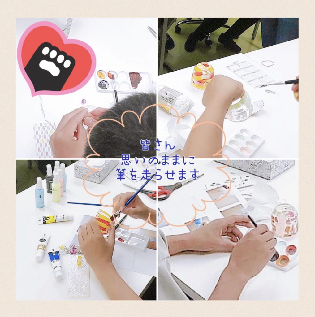可愛いですね~。今回ガラス絵の具も使っているので一度しっかり乾かして、後ほど事業所内に飾りました。普段作成をされない方も久しぶりに筆を持ったという方も、最初は戸惑いながらでしたが、皆さん楽しそうで、こういう時間も良いなと感じました。M先生、ありがとうございました(*^^)v