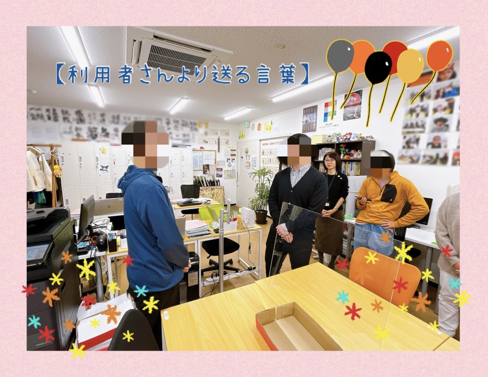 仲の良い利用者さんからの送る(贈る)言葉。利用者さんはNさんのことを、とにかく優しい男だと話されていました。そうなんです、とても優しいのです。はっきり言う割にあとから自分の発言が気になってしまったり。繊細な一面も持っています。利用者さんは周りの皆さんのことをよく見ていらっしゃるなと思いました。