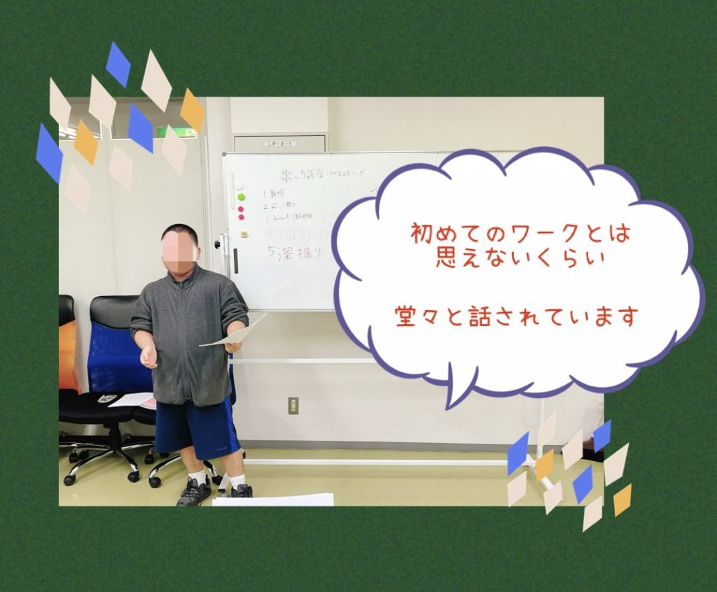 今回は利用者さん主催の歌ワークについてご紹介いたします。初めてのワーク主催ということで主催者の Iさんは大変緊張されていました。しっかり準備をされていて、何人参加してくれるのだろうという心配もあったようですが、当日たくさんの利用者さんが参加をされていました。