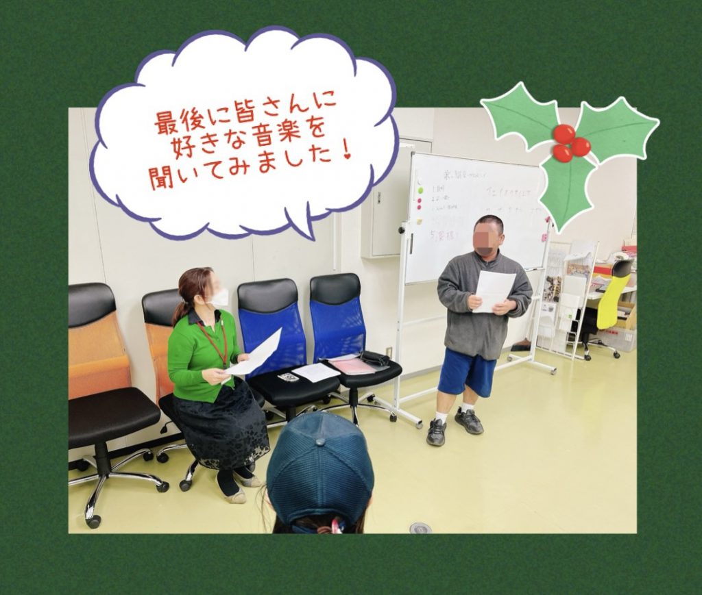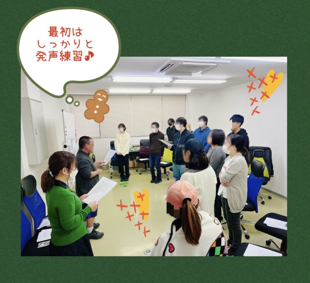 今回の曲はクリスマスが近いこともあり「サンタが街にやってくる」でした。皆さん聞き馴染んでいる音楽。クリスマス気分も盛り上がります。今回のワークでは、声を出すことが恥ずかしい方には歌わずともその場を楽しんでもらうということを大事にされていました。