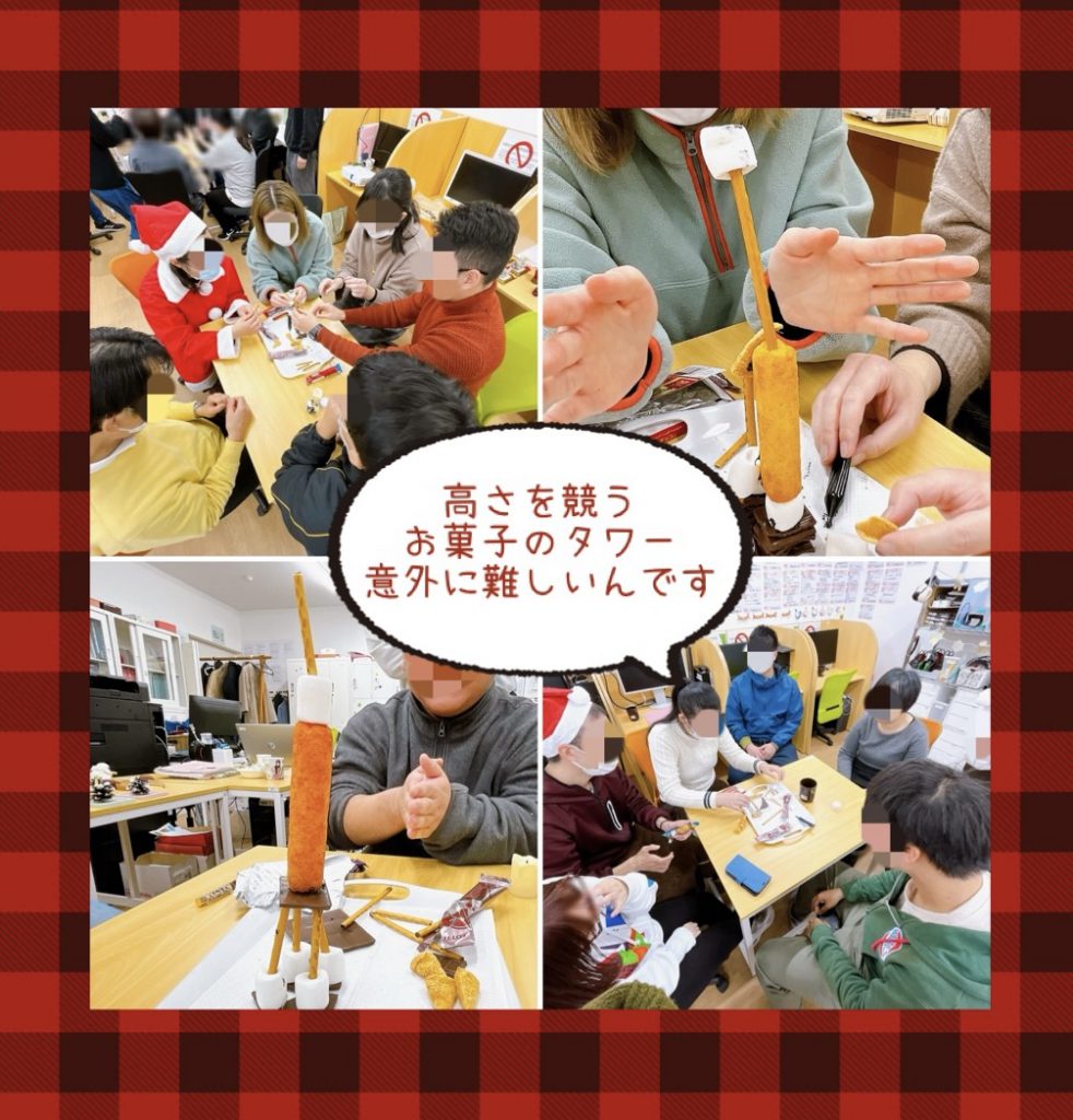 実行委員さんたち、ゲームの準備もばっちりです。一部ご紹介いたしますね。ひとつはお菓子タワー☆高さを競います。時間制限もある中、チームで作戦を考えて組み立てていきます。組み立てていくうちに崩れたり、折れたり(笑) なかなかの混戦模様でしたが、皆さん工夫されてました。立てたタワーはそのあとみんなで頂きましたよ。