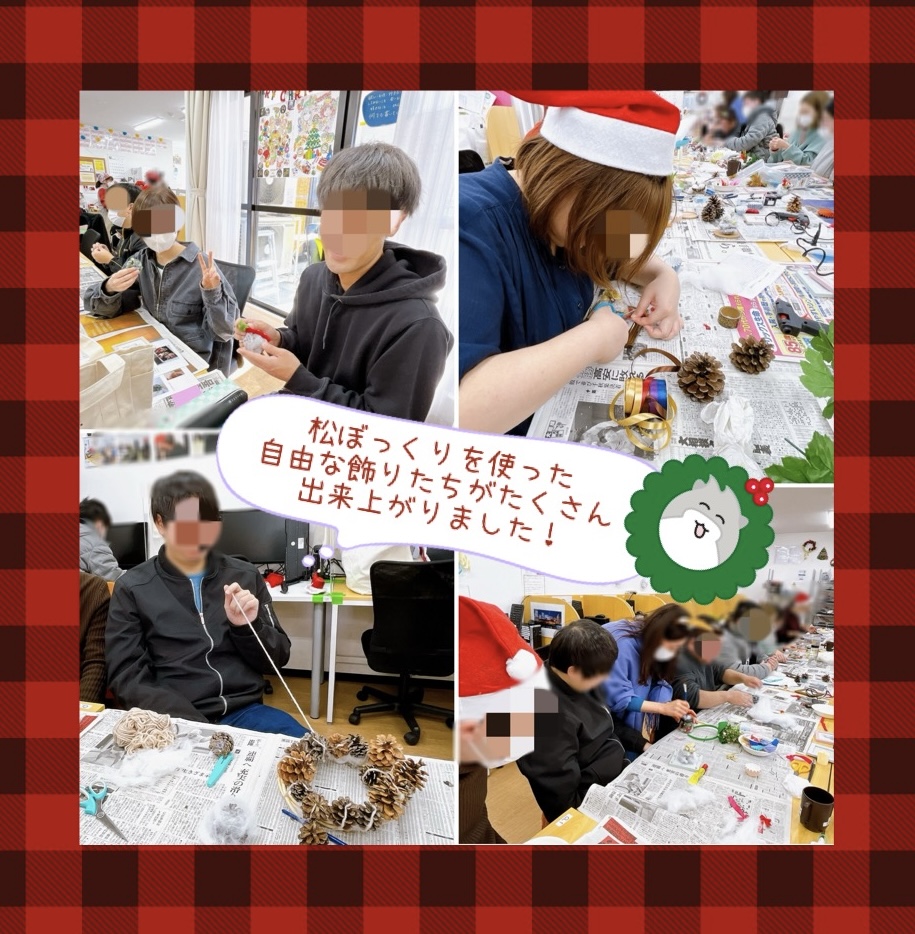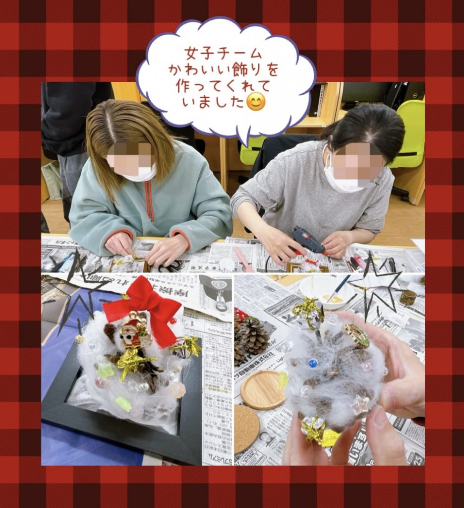 この度選出されたクリスマス実行委員は3名の利用者さん。準備は11月からスタートしました。打ち合わせを重ね、役割分担をして、買い出しに行ったり、制作したり、さまざまな準備をされてきた実行委員さんたち。無事本番を迎えました。
