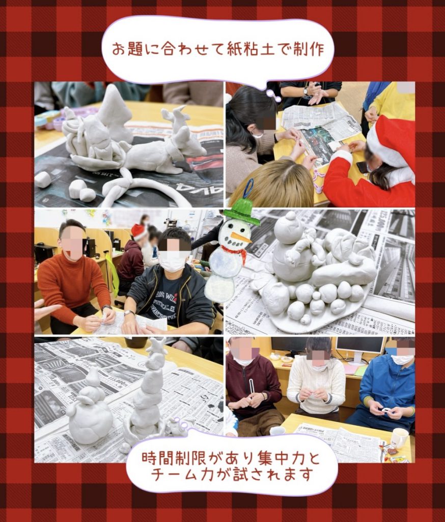 お題が出まして、それに伴った作品を紙粘土を使って作っていきます。個人で作ってもOK。チームで一つの作品を作ってもOK。お題は「スイーツ」と「クリスマス」でしたね。