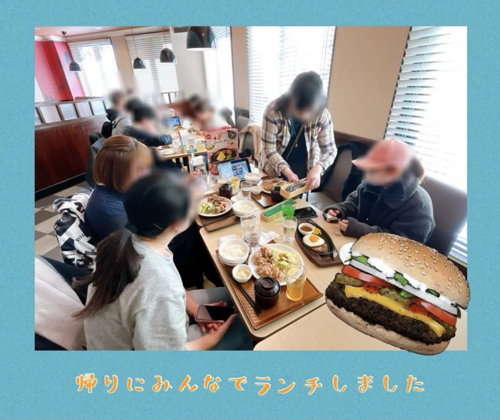 いつも事業所で一緒にお昼をしておりますが、外食することは多くないので新鮮です。皆さんも楽しかったのでしょうか、クーポン出してくれたり、デザートに目移りしたり、メニューを選ぶ時間がびっくりするほど長くて…決まらない(笑) とはいえわいわいとしたそんな時間もたまにはいいものですね。