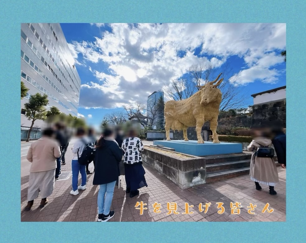 参拝を済ませたあとは、楽しみにしていた食事会です。予約していた時間に間に合うように向かいます。道中大きな牛がいました。皆さん思わず立ち止まっていましたが、これは何の牛なのでしょうか。高崎で過ごしているのに知らないことが多いものですね(;´・ω・)