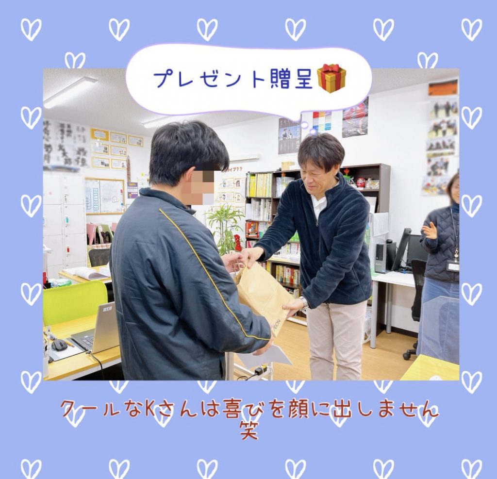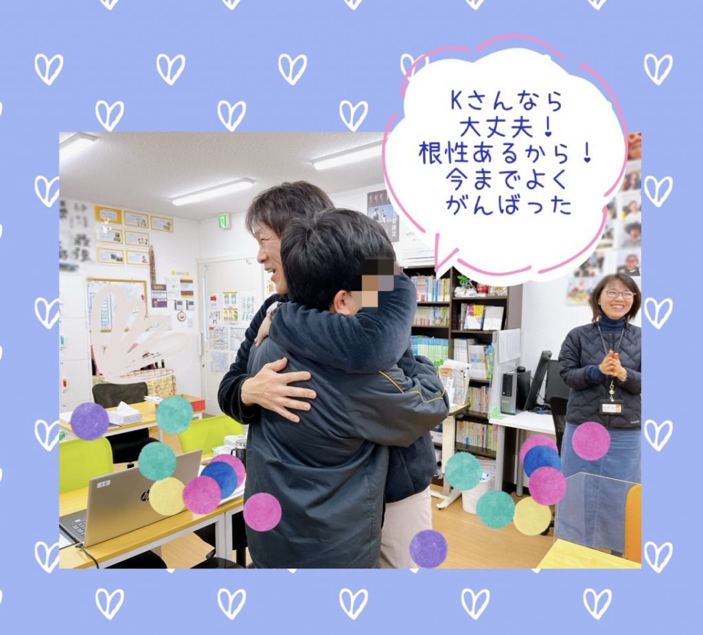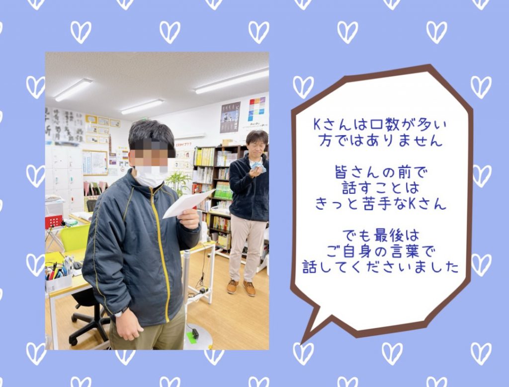 Kさんは黙々と努力される方ですから、アピールなどはいたしません。でも、彼はいつも着実に物事を進めていました。できなかったことも少しずつできることに変えていました。グループワークでは、必要なら発言をされて、にこにこしながら参加されていました。個人的に癒されました(´ー`)