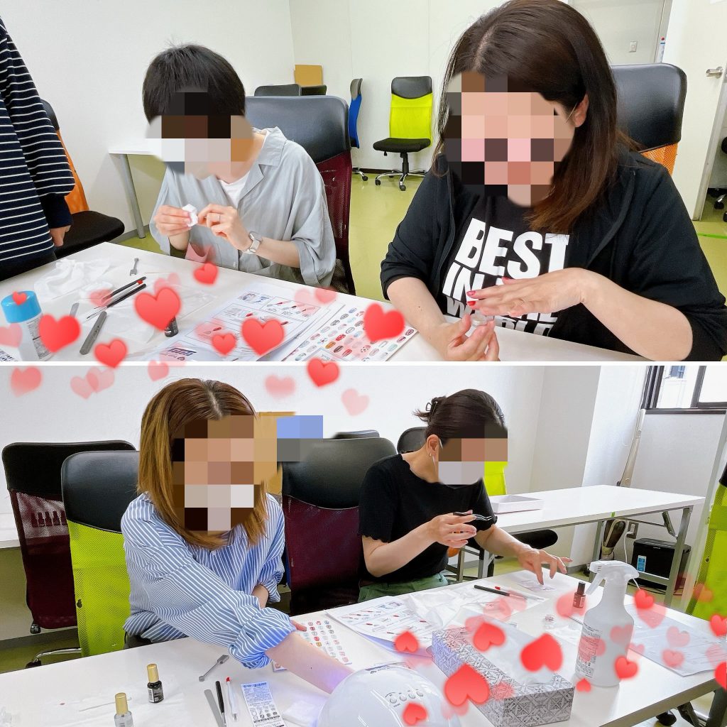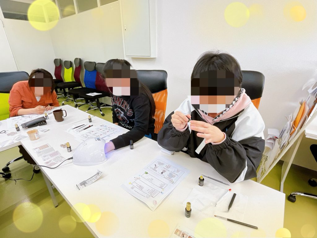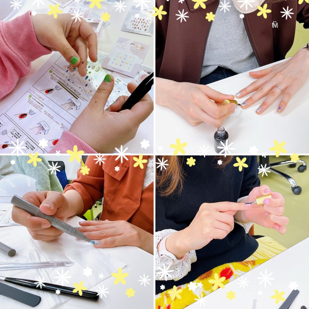 今は100均や3コインズでもネイル用アイテムが安価で手に入りやすく、手軽に始められるようです。実際買い出しではダイソーさんやセリアさんにお世話になりました。二人の先生からレクチャーを受けた参加者の皆さんは、それぞれのペースで爪を整えて色を乗せていきます。