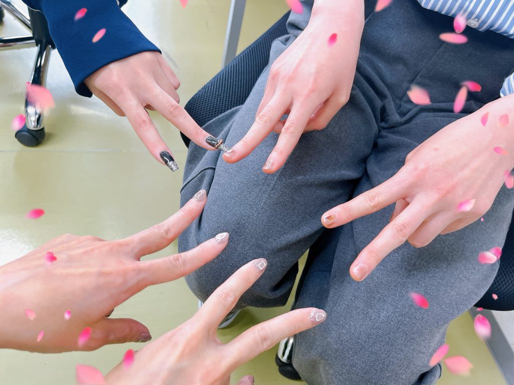 お二人ともお家でご自身のネイルをされていて、爪先が美しいです。趣味の範囲なので…と謙遜されていますが、毎回とても綺麗に仕上げています。ジェルネイル用のライトもお家にあるそうですよ。ネイルは気分が上がるだけではなく、爪を噛んだりむしったりする癖がある方にも、予防としておススメです。