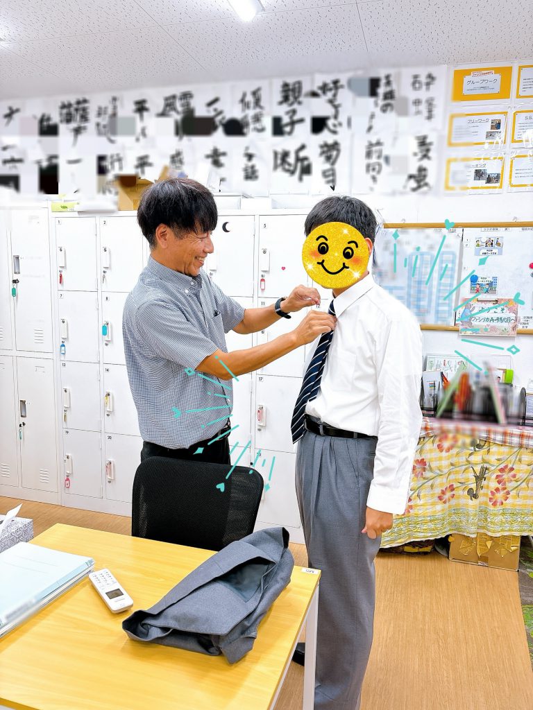 さて、先日の様子。面接です。普段私服で通所される皆さんも、この時ばかりはびしっとスーツで臨みます。Kさんも面接の時間に合わせて着替えて準備をされていました。でもネクタイがね…不慣れなもので。てんやわんやになっておりましたが、そこは問題ありません。職員が手慣れた様子で直します。
