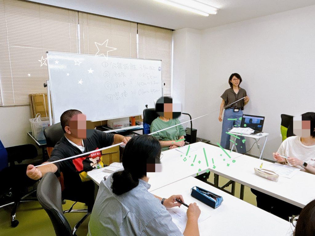 距離感についても考えました。パーソナルスペースという言葉は皆さんご存じかと思います。人によって心地よい距離感は違うもの。男性と女性でも違いがあるそうです。メジャーを使って実際の距離を確認しました。