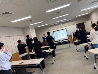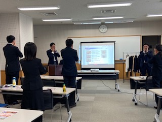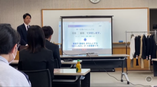 実際に、”採用面接官”もされていたAOKIのエリアマネージャーの西村さん、AOKI若槻店 小坂店長とともに実際のスーツを見ながら、挨拶🗣️入室時のお辞儀の角度などなど基本の基からとってもためになるお話しをご講義いただきました!