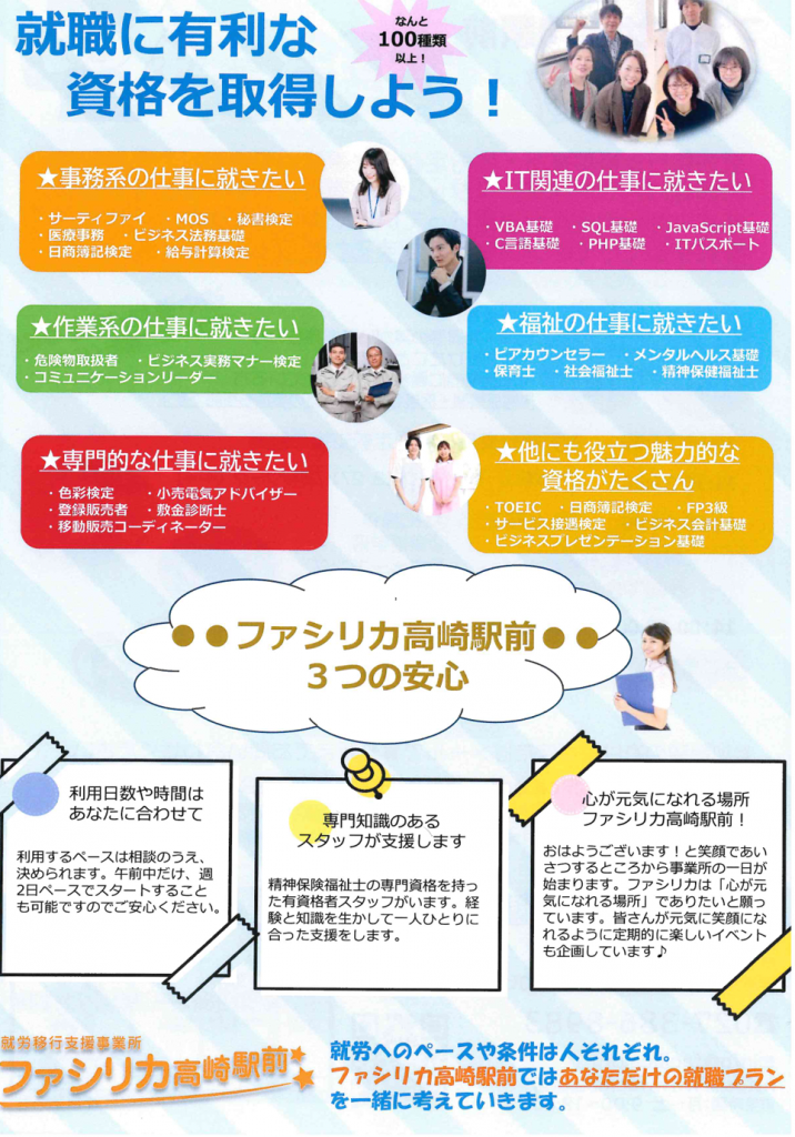 ファシリカ高崎駅前では、仕事に役立つグループワークや職場で役立つコミュニケーション、面接講座など就職に向けた準備として様々なプログラムを実施しています。また、インターネットを利用した学習システムやビジネススキル研修「e-ラーニング講座」も無料で学ぶことができます!
