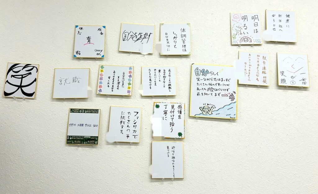 さて、今年は利用者の皆さんに恒例の書初めではなく、色紙に「今年の目標」を書いて頂きました。