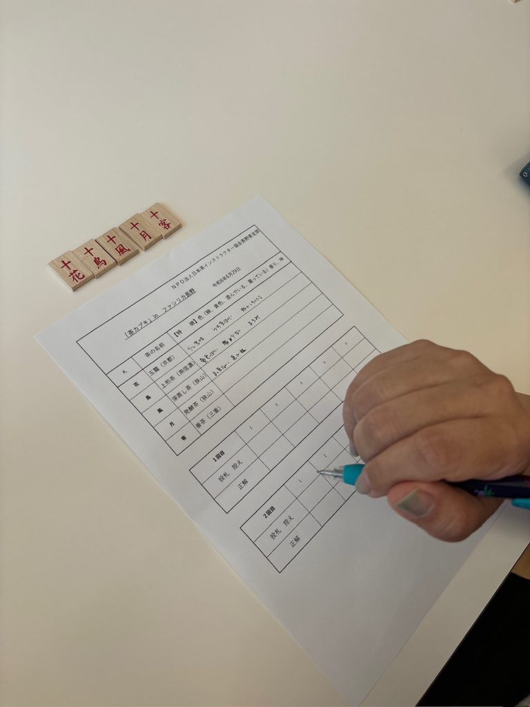 「花・鳥・風・月・客」の名前がついたお茶を飲み、それぞれの銘柄や産地などを見極めて当てる遊びです。