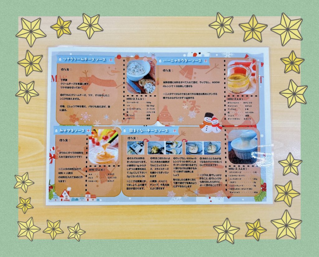 さて、本日は毎年恒例のクリスマス会のブログです。今年もクリスマス会に向けて実行委員さんたちが中心になって、準備から当日までたくさん頑張ってくださいました。実行委員さんたちは毎年違いますので、毎年違うクリスマス会になります。午前中はスイーツ&野菜スティック作り。実行委員のNさんが作り方やメニューを綺麗に作ってくれました。